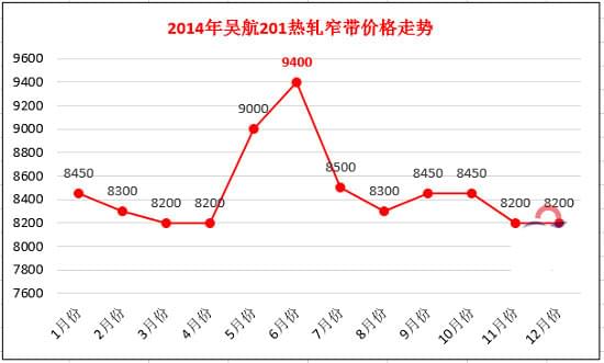 在國內(nèi)所有生產(chǎn)不銹鋼熱軋窄帶的民營鋼廠當(dāng)中,主要的鋼種是201。以吳航201熱軋高銅料為例,價(jià)格在6月份達(dá)到了全年的頂峰,為 9400元/噸。隨后出現(xiàn)下滑,后停留在8200元/噸,為2014年畫上了句號。其中,2014年吳航201熱軋窄帶價(jià)格走勢如下圖所示: